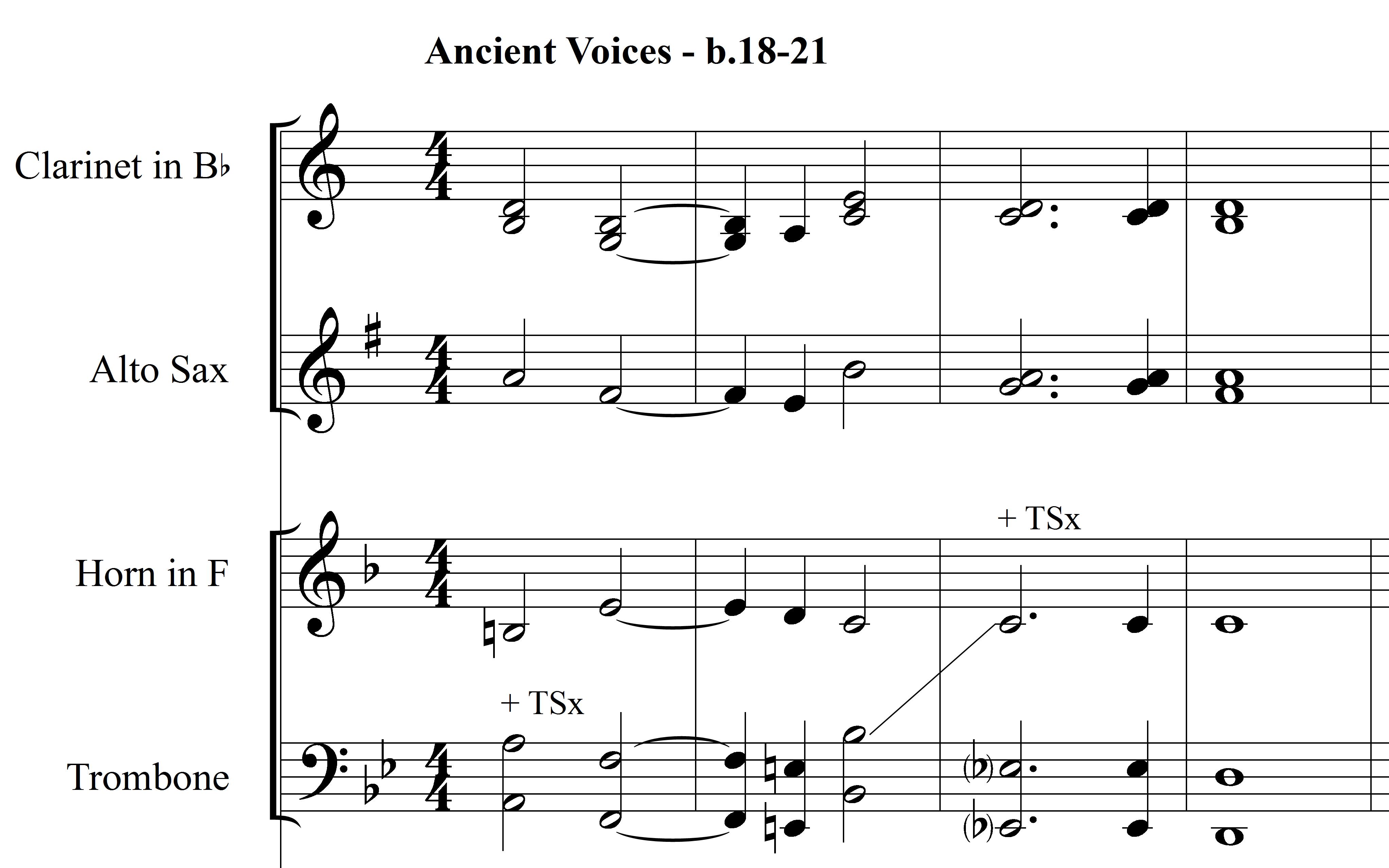 This is a continuation of my previous post where I began looking at Michael Sweeney’s piece Ancient Voices. In this post I’ll look at some of the harmony and orchestration approaches that Michael uses.