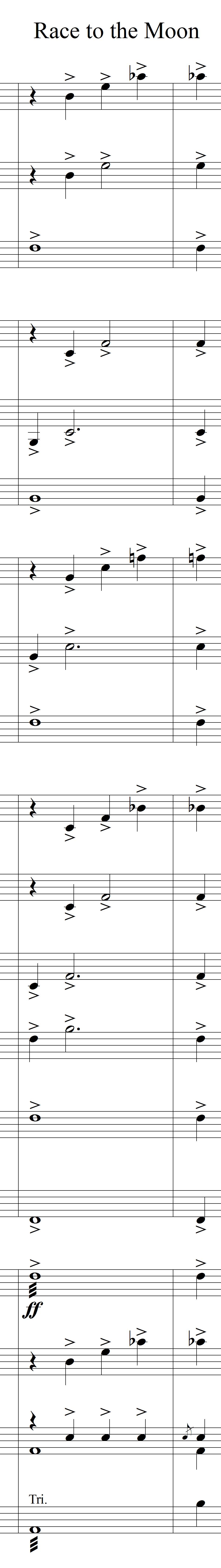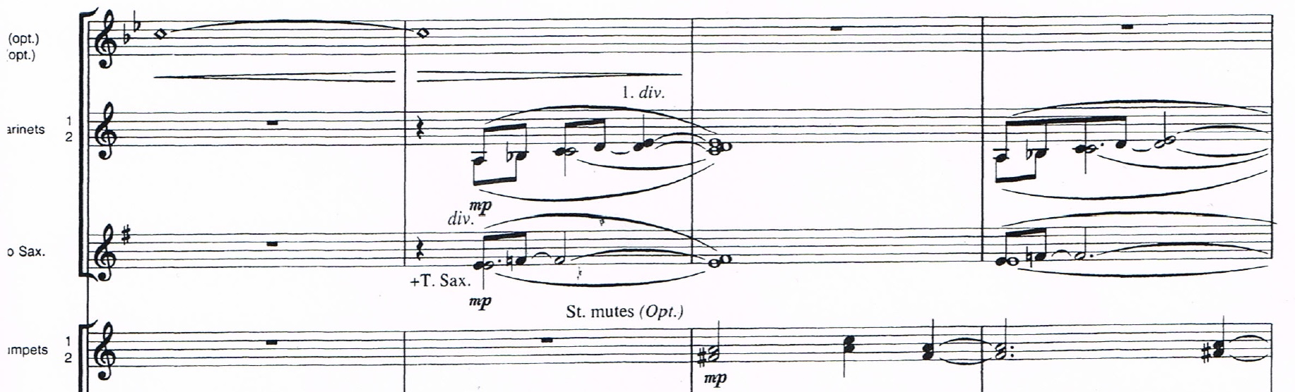 - 1st clarinet outlines the entire chord. Getting pyramid structures/entries to work in an ensemble can be tricky. For some reason, students struggle with having to enter one after another and someone always misses their entry. By having everyone start together and then some players just stop “early” works much better. Having the 1st clarinet play the entire cluster entry means that every entry/note will be heard, every time. I used a variation on this approach at the end of my piece Race to the Moon.
